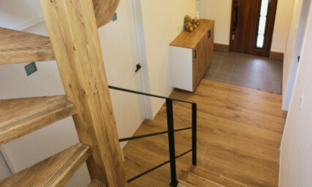 階段の素材や手すりのデザインはインテリアのアクセントにもなり、たたきからふと見上げたときに感じる抜け感がおしゃれな雰囲気をつくり出します。